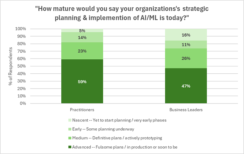 When asked, both subsets of respondents — business leaders (e.g. CEOs, COOs, CROs, CMOs) and technical practitioners (e.g. CTOs, CISOs, CIOs, CDOs) — on average confirmed that the planning & implementation of AI features is well underway at their organizations. This is broadly in line with other recent studies of enterprise AI adoption (e.g. IBM’s), though our bifurcation of respondents also highlights how business leaders generally viewed their organization’s AI strategy/implementation as less mature than practitioners.