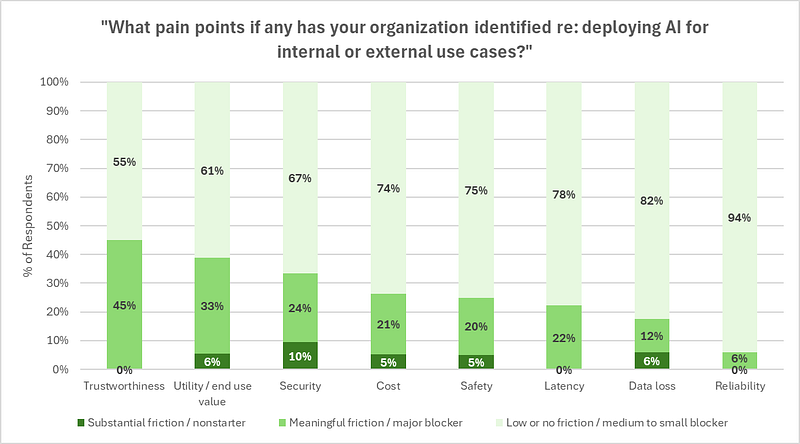 Enterprises are keenly aware of the technological and economic problems of implementing genAI into their production applications. When asked about the biggest pain points to adoption, respondents pointed most often to the well-documented challenges re: hallucinations / limited trustworthiness of outputs. Perhaps more consequentially, respondents called out a lack of utility and end user value as a key friction as well, highlighting that — despite the aforementioned enthusiasm — many enterprises are still in the midst of understanding where and/or how generative AI can improve their existing products and services, or enable the creation of new ones.