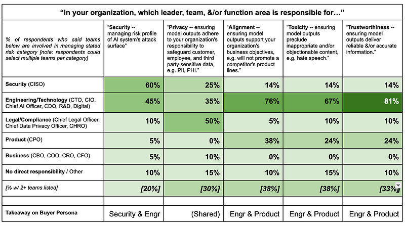 Zeroing in on safety risks of generative AI systems in particular, we also asked respondents to tell us which teams were responsible for the various categories of safely & securely deploying genAI powered applications. While some answers adhered to expectations (eg CISOs were by and large reported to be responsible for managing genAI security/attack surface risk), our bigger takeaway was that the ownership of managing such enterprise genAI risks was typically diffuse across functions — respondents generally indicated that they rely on some combination of their CTO/engineering org and either Legal, Product, Security to navigate these issues. For most criteria we asked about, this dynamic equated to approx. a third of respondents indicating that decision-making responsibility was currently done by committee via multiple teams or functional heads.