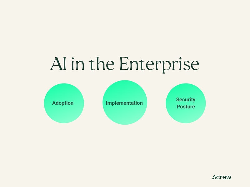 As long-time investors in both artificial intelligence and cybersecurity as core thesis priorities, we at Acrew Capital wanted to take this moment to better understand which business use case and security posture considerations enterprises were using to make technology strategy decisions in this new AI-first innovation cycle. To support our thinking, we ran a survey with several dozen enterprise business leaders and senior technical practitioners/executives in our network to get a closer look at how their organizations were navigating these choices, and what that might imply about where there is the most or least opportunity for startups. We’re sharing our findings below; if you’re currently building in an adjacent category and/or working on products that facilitate scaled, compliant enterprise AI adoption, we’d love to meet you.
