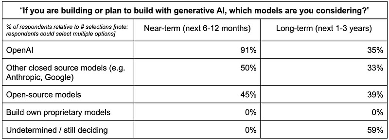6. OpenAI leads the pack in early experimentation and prototyping, but enterprises are far less certain on their long-term model layer strategy