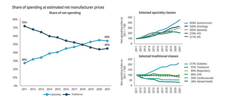 High-value specialized products: Specialty medicines accounted for 55% of net spending in 2022, up from 28% in 2011, with continued growth driven primarily by autoimmune and oncology therapies (IQVIA, 2023)
