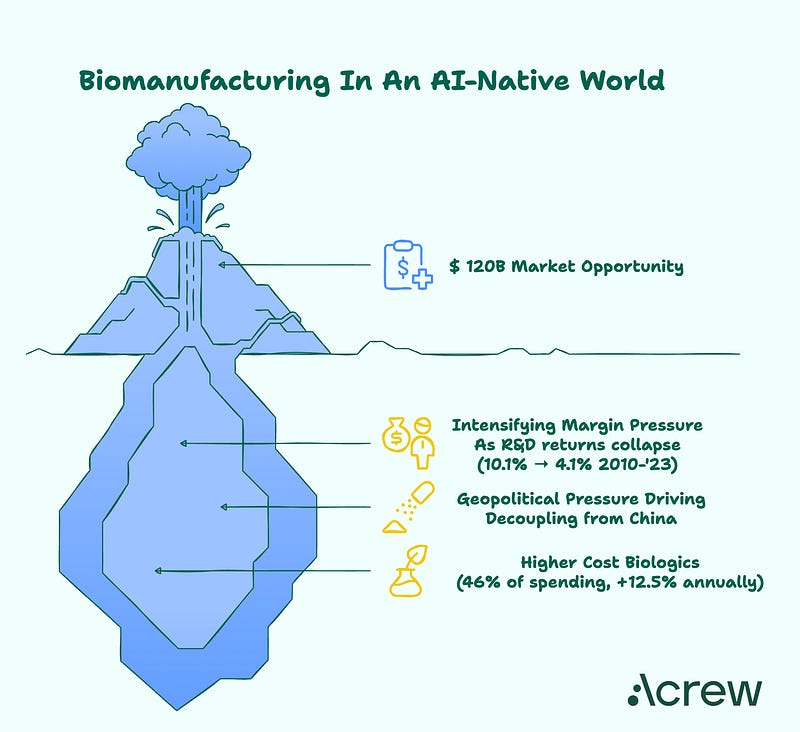 The biopharma manufacturing segment represents approximately ~$120B+ (assuming 23.5% margin for manufacturing costs; $511B biologic market) in manufacturing costs across biologics.