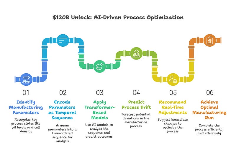 Next Token Prediction. In practical terms, each “token” represents a discrete state in the manufacturing process such as pH level at a given timepoint, dissolved oxygen reading, impeller speed, cell density, or nutrient concentration profile. By encoding these parameters as a temporal sequence, transformer-based models can learn the probabilistic relationships between states and use next-token prediction to forecast process drift, anticipate deviations, and recommend real-time adjustments. This approach effectively “auto-completes” the optimal manufacturing run.