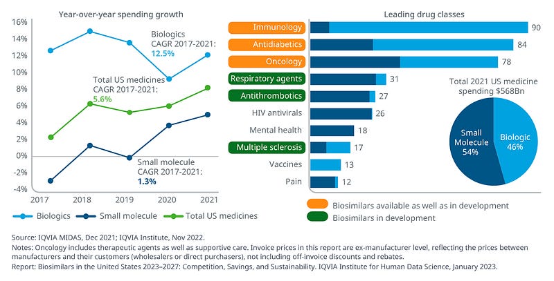 Rising market share: Biologics now comprise 46% of total medicine spending in the U.S., growing at 12.5% annually, significantly faster than small molecules (IQVIA, 2023)