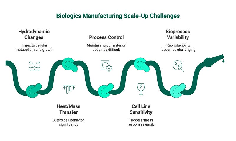 Biologics manufacturing scale-up represents a critical “valley of death” in the $448.1 billion biopharmaceutical market where promising therapies often fail due to manufacturing challenges rather than efficacy or safety concerns. Unlike small molecule drugs, biologics are produced in living systems that introduce immense complexity when scaling from laboratory (5–10L) to commercial production (2,000–20,000L). The economic stakes are enormous — facilities cost $200–500 million to build, each halving of production volume increases unit costs and batch failure rates during early scale-up attempts: