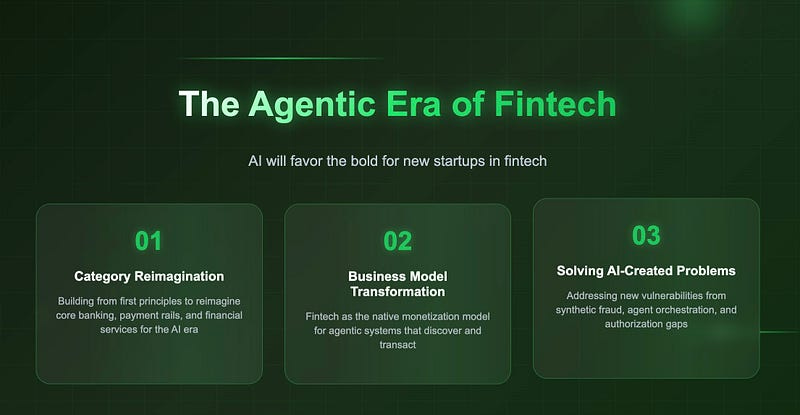 AI offers the tools to reimagine the foundations of financial services — like brittle core banking systems, payment rails built for plastic not silicon, and the very services in financial services that can now be automated. Most incumbents won’t tear it all down to build it back up — they won’t risk dismantling the very businesses that have driven their success. Nor will they take the regulatory risks when they are already in the spotlight. There are exceptions, for example: Stripe has launched agentic payment tools like single-use virtual cards and payment link generation for AI agents, and Coinbase has introduced AgentKit to enable agents to perform on-chain operations. But even they have limits. AI-native startups, by contrast, can build from first principles — reimagining agentic commerce, autonomous finance, and AI-driven financial operations from the ground up.